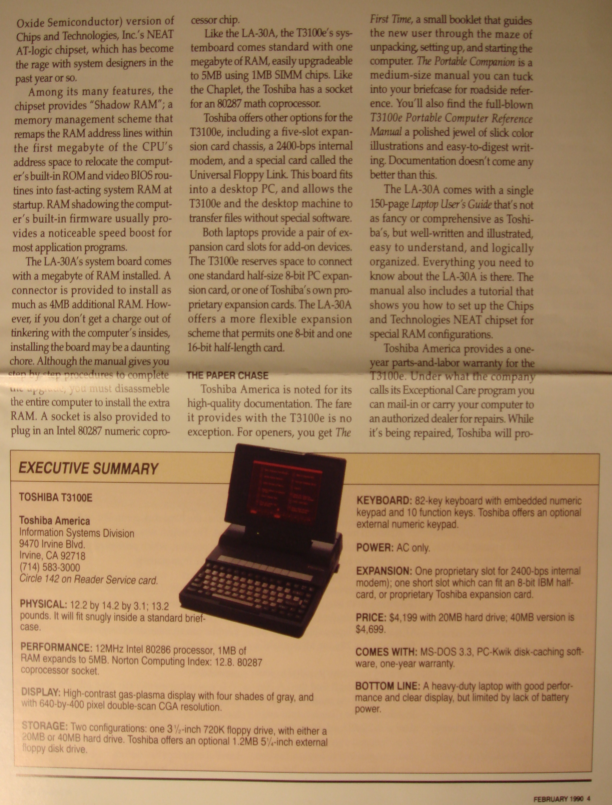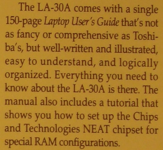 At the start of my career I had no experience in technical writing, but I knew poor English when I saw it, and I had taken a technical writing course in college. After a few days, a computer (with a 20 MB hard drive) was issued to me. I installed Microsoft Word for DOS (not Windows—that long ago!), and I began writing. I told my manager that after rewriting the manual, I wanted my programming position back. It turned out that I never did any programming at that job. I developed an interest in writing. I was so proud when my manuals were printed and packaged with the newly manufactured computers. Incredibly, one user manual was given good marks in Portable Computing magazine when they did a complete product comparison between Chaplet’s laptop computer and Toshiba’s laptop computer. In that article Toshiba was referred to as “Goliath” and Chaplet to “David”. Here are some photos of that manual and magazine article.